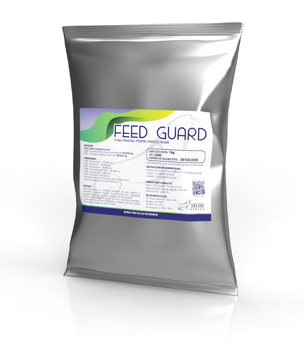 Feed-Guard este un acidifiant (amestec de acizi organici și anorganici), prebiotic (extract de fermentare din Aspergillus oryzae) și fixator de micotoxine (argile polare și bipolare).